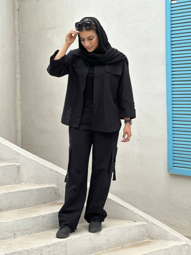 ست لینن شومیز پیراهنی و شلوار کارگو مشکی