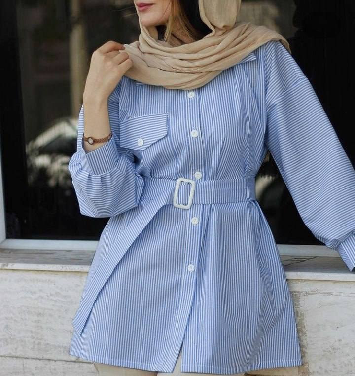مانتو راه راه یقه مردانه کمربند دار