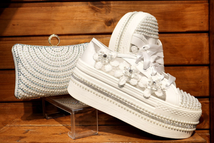 کفش کتونی عروس گلدوزی و نگین کاری لژ ۸ سانتی
